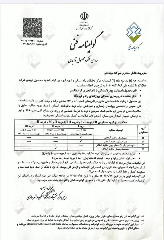 گواهینامه فني بررسی عملکرد پودر لاستیکی کرامفلکس